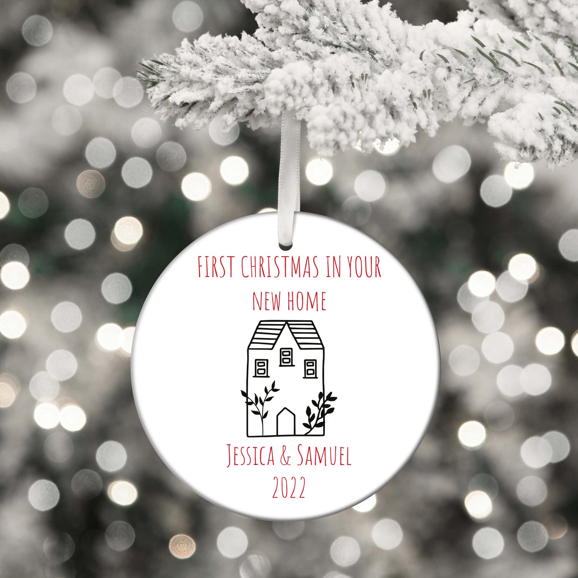 This bauble is printed with 'First Christmas In Your New Home along with a simple house design and personalised with your names and 2022.