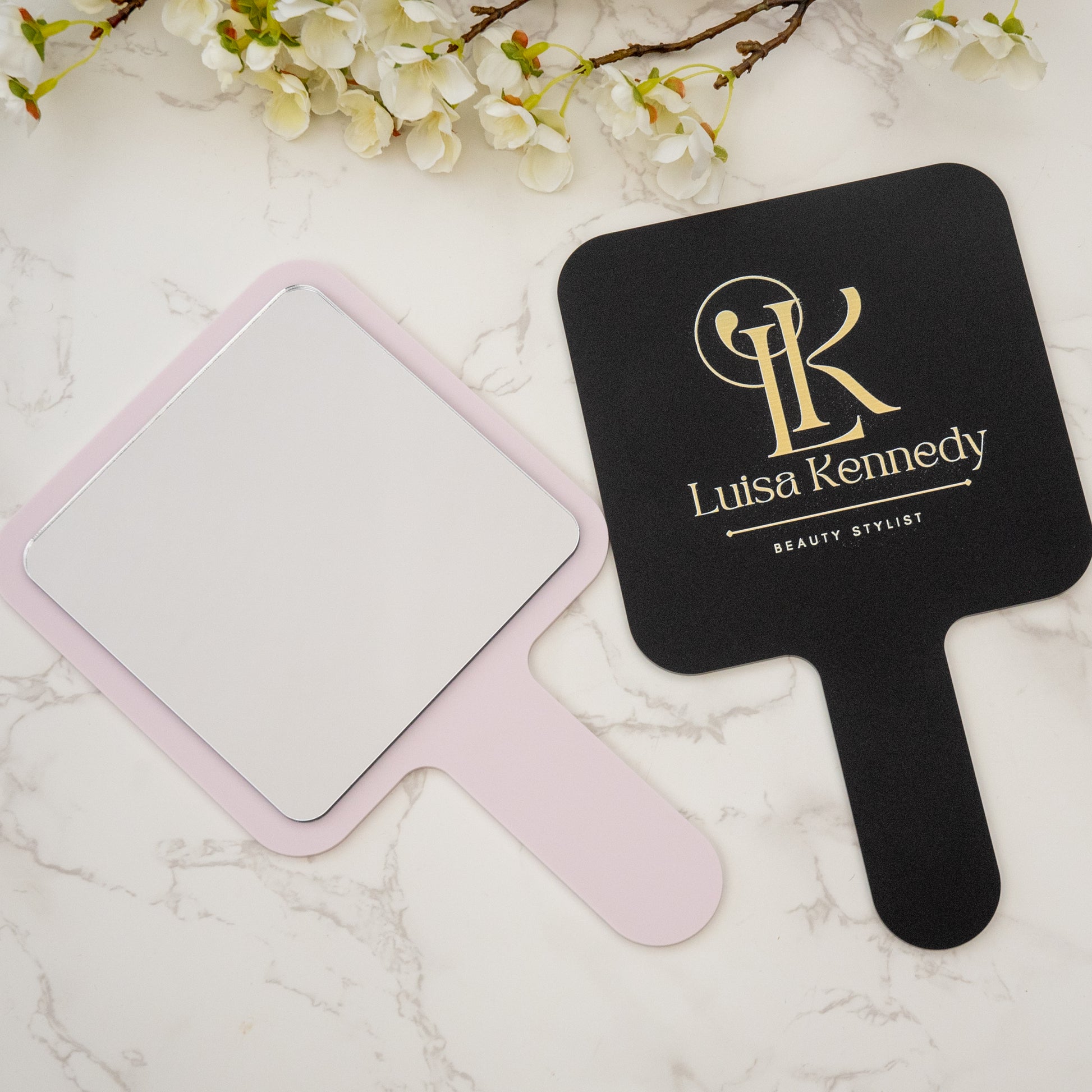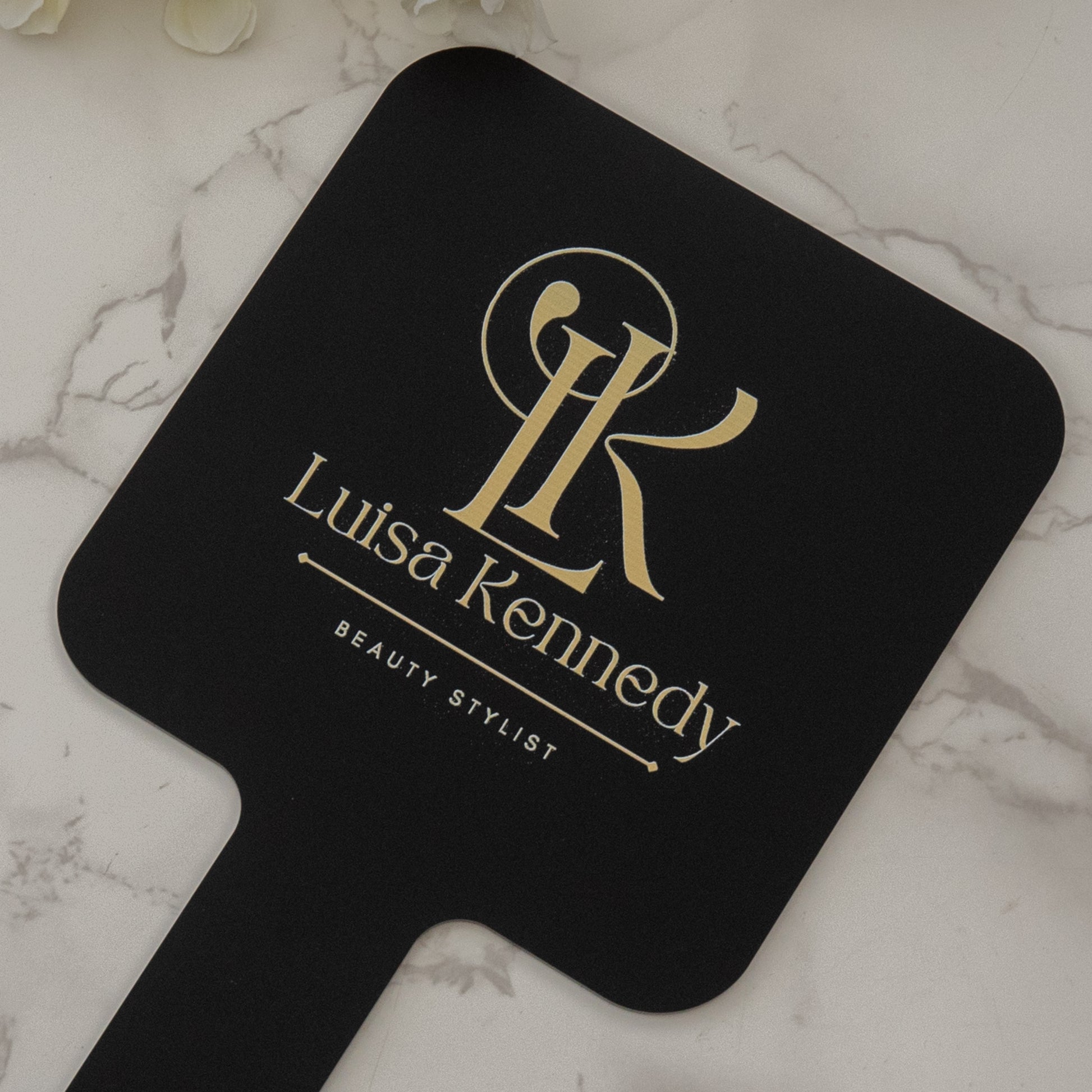Elevate your salon or small business with our Handheld Branded Mirror featuring a custom logo design. Perfect for beauty professionals, makeup artists, and barbers, this compact mirror is a must-have accessory for on-the-go touch-ups and consultations. The sleek aesthetics mirror not only allows for precise makeup application and grooming but also showcases your brand in style. Add a personal touch to your services with our logo mirror that combines functionality and branding seamlessly. Stand out in the industry with this modern and professional tool that is sure to leave a lasting impression on your clients.