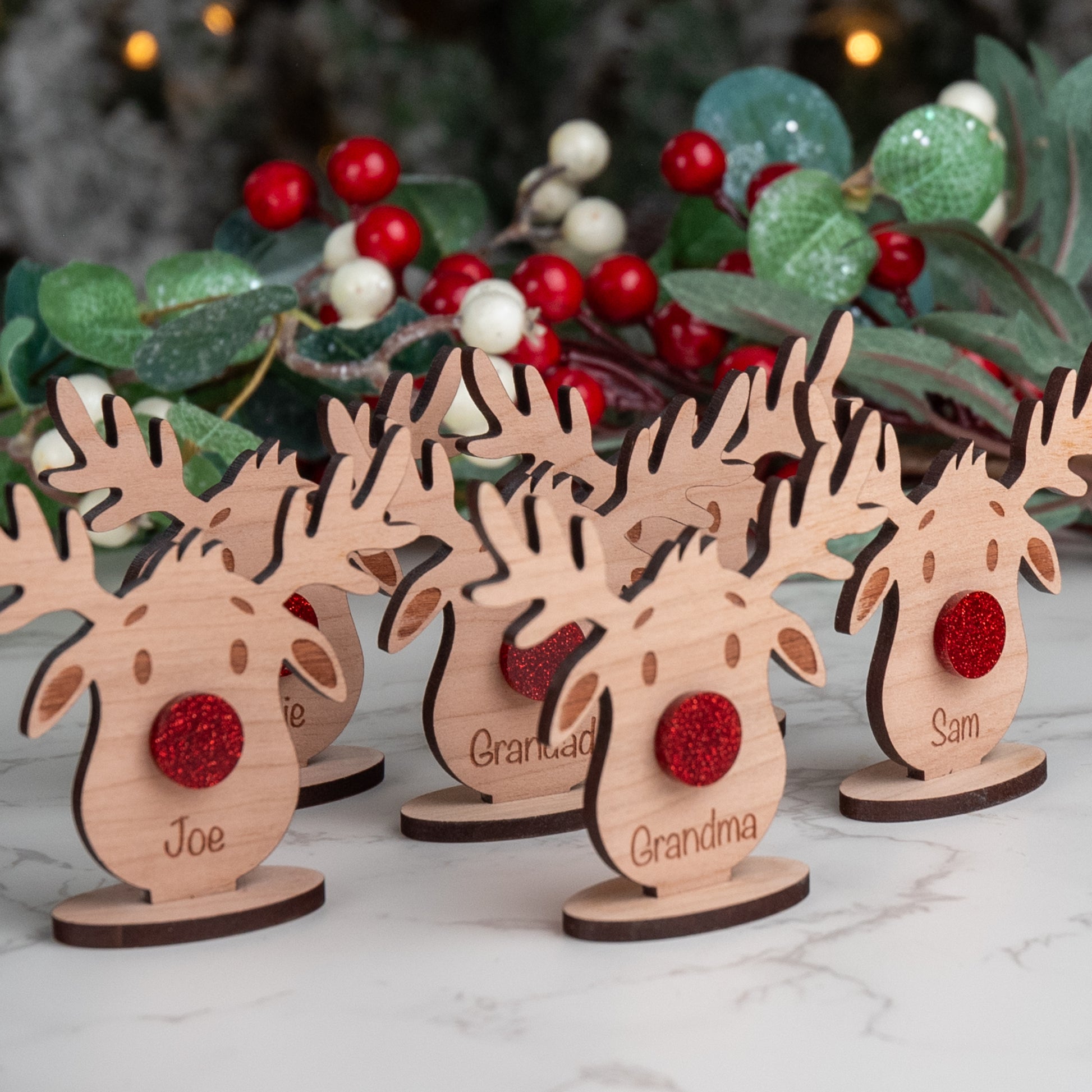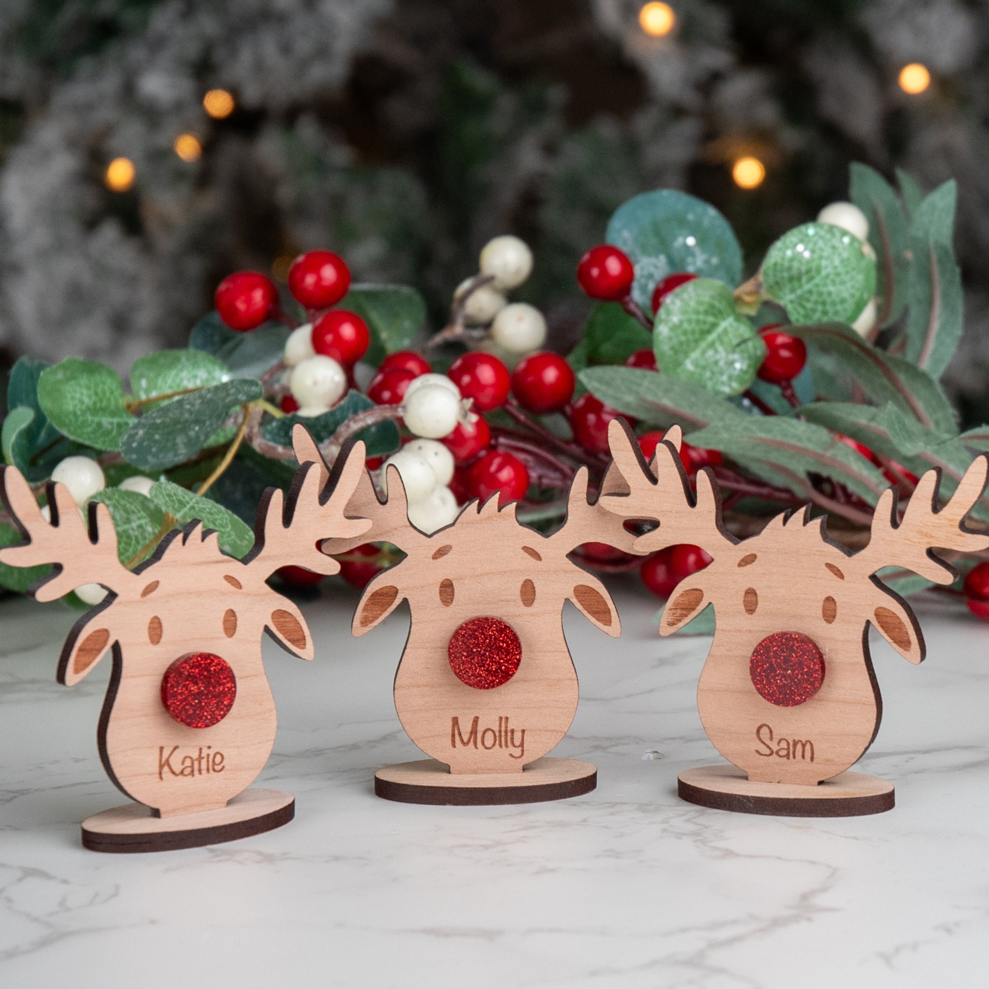Add a touch of festive charm to your holiday table setting with our Customised Wooden Reindeer Place Names, complete with a glimmering red nose.