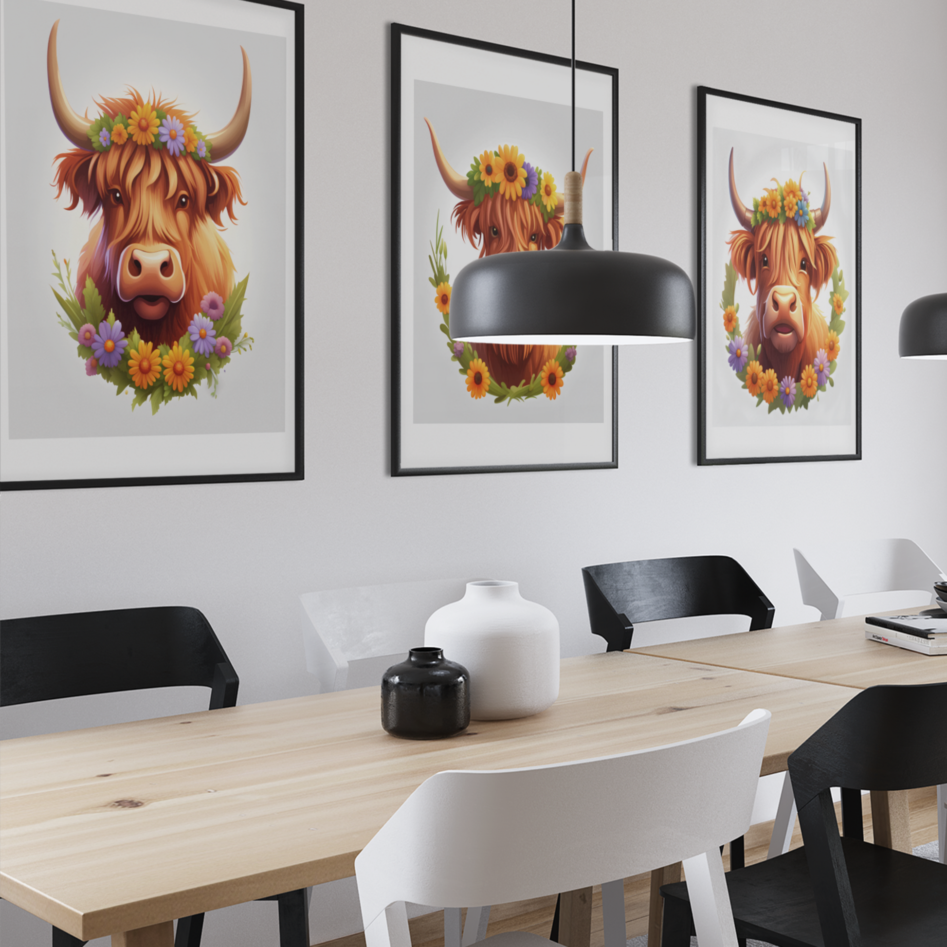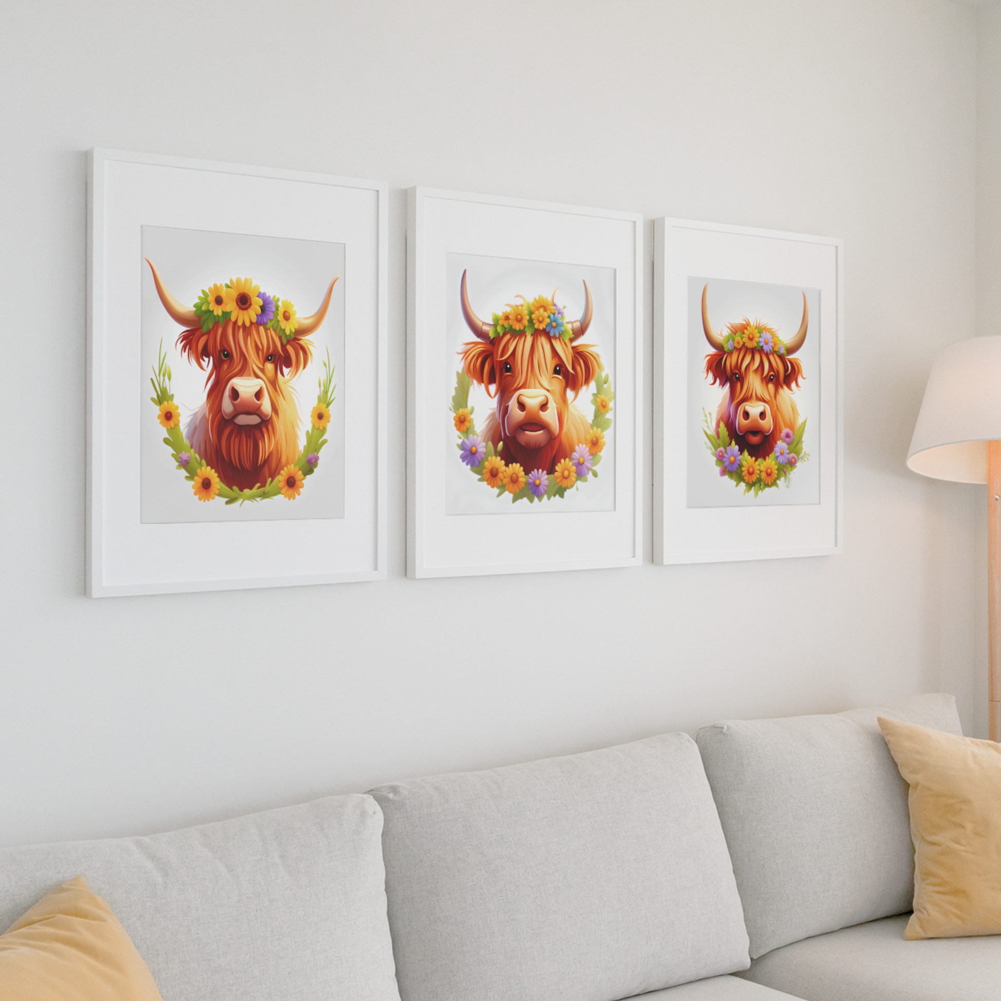 Each piece in this set is thoughtfully crafted to harmonise with a variety of interior styles, whether you lean towards modern minimalism or cozy farmhouse aesthetics. The attention to detail in every frame showcases the intricate textures of the Highland cows' fur and the intricate petals of the surrounding flowers, bringing the scenes to life in a truly mesmerizing way.